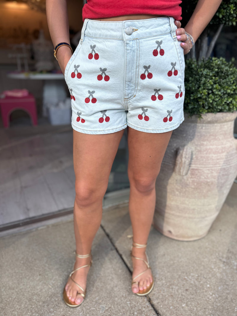 FARM RIO Embroidered Cherry Denim Shorts