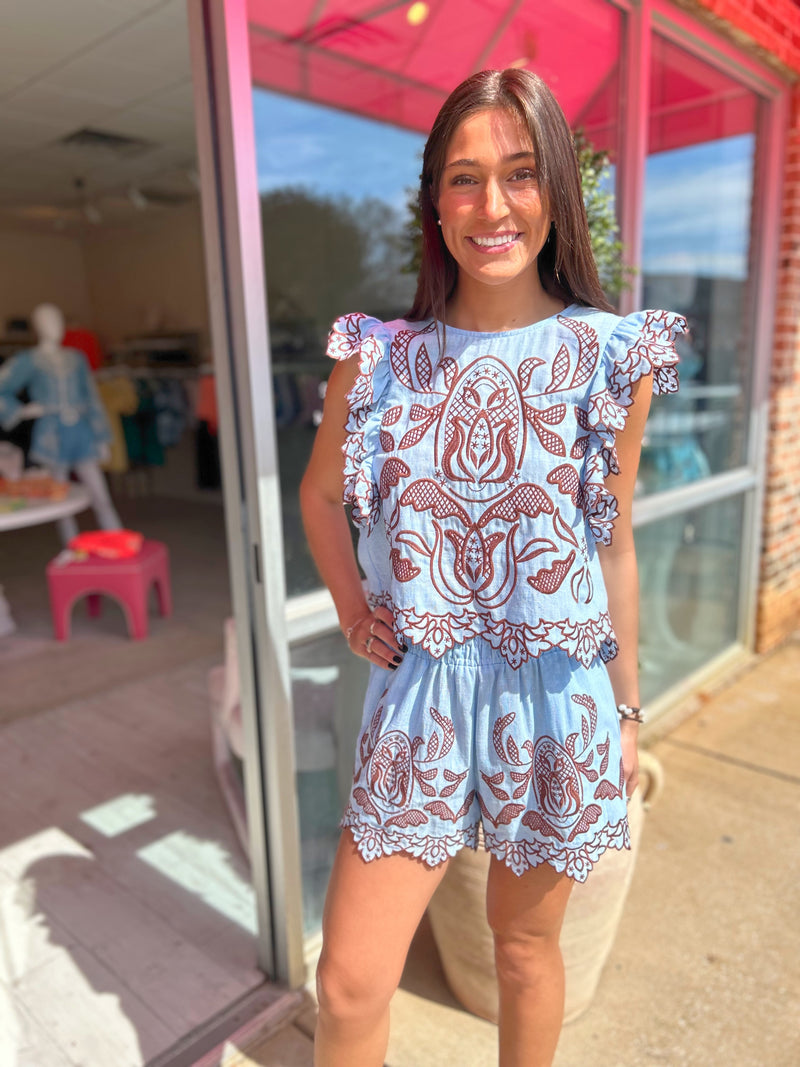 Paige Embroidered Top & Belted Shorts Set