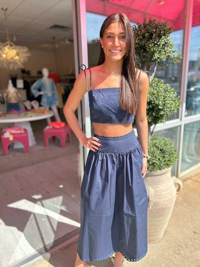 Blythe Embroidery Top & Midi Skirt Set in Navy